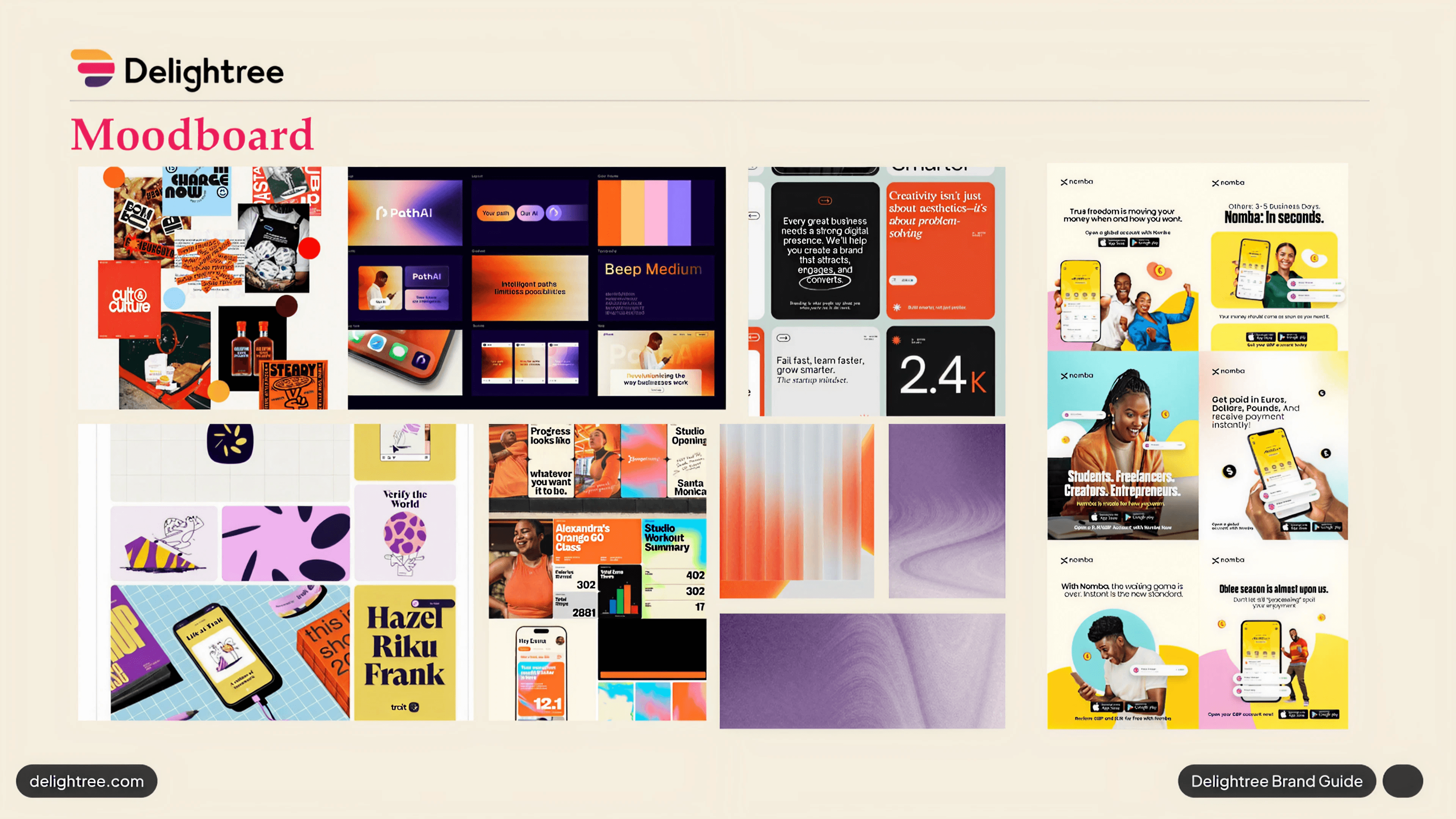 This moodboard explores a visual direction for Delightree that balances structured complexity with playful expression. While the product solves deeply operational problems—training, SOPs, and multi-location management—it shouldn’t feel heavy or overwhelming. Instead, the brand leans into bold colors, gradients, and expressive layouts to create a sense of energy and approachability.